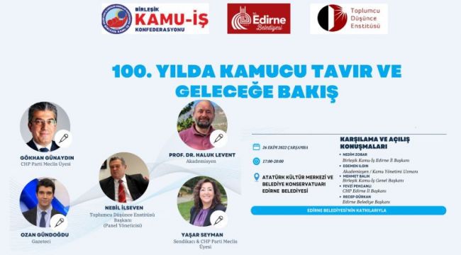 Edirne Belediyesi, Birleşik Kamu İş ve Toplumcu Düşünce Enstitüsü işbirliğinde kamucu yaklaşımın gelişmesi adına 26 Ekim Çarşamba Günü Saat: 17.00-20.00 saatleri arasında Atatürk Kültür Merkezi ve Belediye Konservatuarı’nda “100 Yılda Kamucu Tavır ve Geleceğe Bakış” isimli panel düzenlenecek.