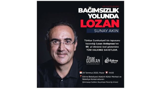 Sunay Akın’ın 24 Temmuz Saat:14.00’te “Bağımsızlık Yolunda Lozan” isimli tek kişilik gösterisinin Edirne Belediyesi Atatürk Kültür Merkezi ve Belediye Konservatuarı’nda düzenleneceğini belirten Edirne Belediye Başkanı Recep Gürkan, 24 Temmuz tarihinin Türkiye için çok önemli bir tarih olduğuna dikkat çekti.
