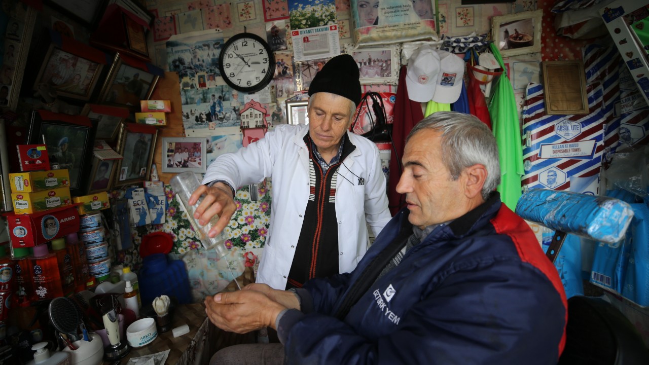 Bu nedenle köyde "musluksuz berber" olarak tanınan Yumurtacı, dükkanında geçmişin izlerini yansıtıyor.