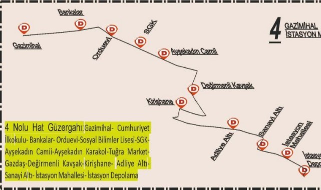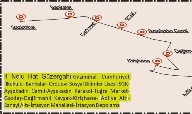 Buna göre, yapılan bu düzenleme ile 4 Nolu Hat; (Gazimihal-İstasyon Mahallesi) hattı Selamsız Sokak, Eski İstanbul Caddesi ve Uzunkaldırım Caddesini kullanmak yerine Gazimihal depolama alanından kalkış yaparak Atatürk Bulvarını takiben Bankalar, Orduevi, Ayşekadın duraklarından Şehit İstiklal Vardar Caddesi istikametinden Abdurrahman Mahallesi, Kirişhane ve İstasyon mahallelerimize hizmet verecek olup, bu toplu ulaşım araçları güzergâhta ki seferlerine 17.04.2023 Pazartesi günü saat 07.30’ da başlayarak, 20-30 dakika aralıklar ile hizmetine devam edecek. (Haber Merkezi)