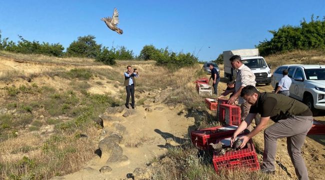 Yozgat Keklik Üretim İstasyonundan tahsisi yapılan kekliklerin doğayı bırakılmasına, DKMP Edirne Şube Müdürü Kerim Yapça, DKMP ekipleri ve sivil toplum kuruluşlarının üyeleri katıldı. (AA)