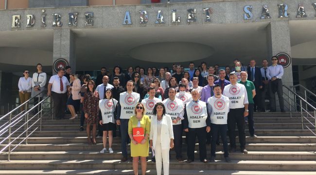 Adalet personelinin özlük haklarının iyileştirilmesi amacıyla Adalet Sen (Adalet Çalışanları Sendikası) Genel Merkezince alınan karar doğrultusunda adliye binası önünde eşzamanlı basın açıklaması yaptı. Edirne’de gerçekleşen basın açıklamasını Edirne Şubesi Basın ve Halkla İlişkilerden Sorumlu Başkan Yardımcısı Özgül Mutlu okudu.