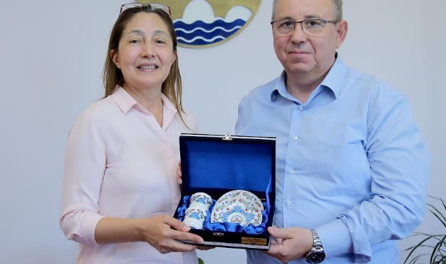 Ziyaret sonunda Rektör Prof. Dr. Erhan Tabakoğlu, günün anısına Prof. Dr. Meryem Aktoz’a hediye takdiminde bulundu. (Haber Merkezi)