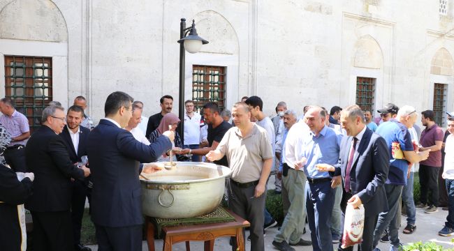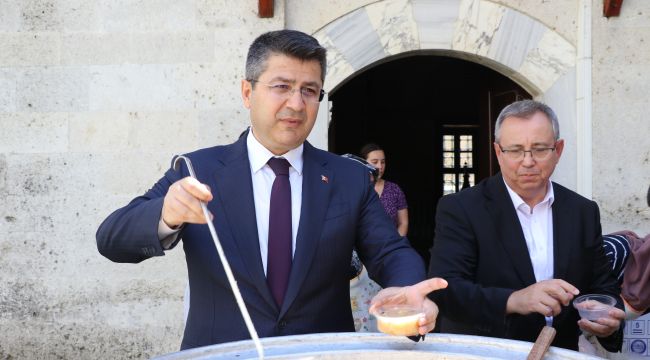 Edirne Valisi H. Kürşat Kırbıyık, Trakya Üniversitesi Rektörü Prof. Dr. Erhan Tabakoğlu ve Sultan II. Bayezid Külliyesi Sağlık Müzesi Müdürü Ruhi Pehlivancık vatandaşlara aşure ikram etti.