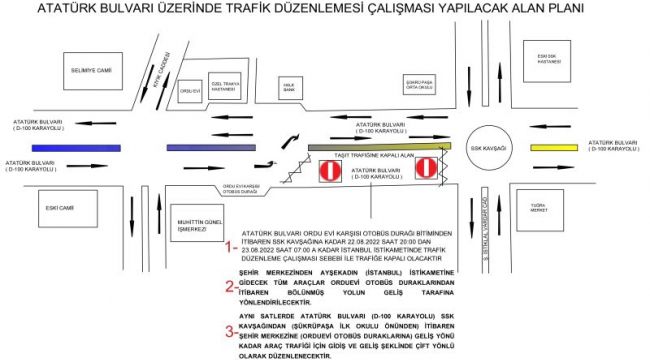 Aynı saatlerde ATATÜRK BULVARI (D - 100 Karayolu) SSK Kavşağından (Şükrüpaşa İlkokulu önünden) itibaren şehir merkezine (Orduevi Otobüs Duraklarına) geliş yönü kadar araç trafiği için gidiş ve geliş şeklinde çift yönlü olarak düzenlenecektir.