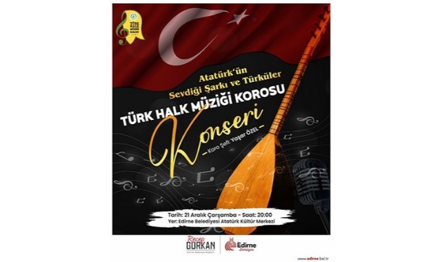 21 Aralık Atatürk’ün Edirne’ye Gelişinin 92. Yılı Etkinlikleri kapsamında Edirne Belediyesi Türk Halk Müziği Korosu tarafından Atatürk Kültür Merkezi ve Belediye Konservatuvarı’nda düzenlenecek konserde Gazi Mustafa Kemal Atatürk’ün sevdiği şarkı ve türküler Edirneliler için seslendirilecek.