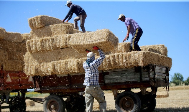 Tarla sahipleri tarafından traktör römorkunda saman balyalarının bulunduğu tarlaya götürülen işçiler kısa bir planlamanın ardından çalışmalarına başlıyor.