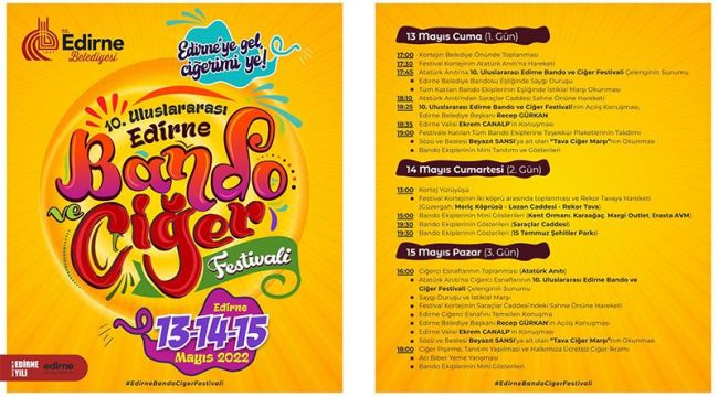 Pandemi nedeniyle 2 yıldır yapılamayan Uluslararası Edirne Bando ve Ciğer Festivali yeniden başlıyor. Edirne Belediyesi’nce düzenlenecek Uluslararası Edirne Bando ve Ciğer Festivali’nin programı belli oldu. 13-14-15 Mayıs 2022 tarihlerinde düzenlenecek olan festivalde Edirneliler; bir kez daha müziğin evrenselliği ile buluşacak. Festivalde ayrıca Edirne’nin marka lezzeti olan tava ciğer ikramı yapılacak. Festivale, İstanbul Büyükşehir Belediyesi Kent Orkestrası, İzmir Seferihisar Belediyesi Bando Ekibi, Bursa Büyükşehir Belediyesi Bando Ekibi, Romanya’dan Rodna Bandosu, Bulgaristan’dan Dobriç, Burgas ve Tirgovişte Bando ekipleri, Karadağ’dan Herceg Novi Bandosu, Moldova’dan Zaim Bandosu, Arnavutluk’tan Elbasan Bandosu, Macaristan’dan Szekesfehervar ve Dunaszekcsö Bandosu ekipleri katılacak.