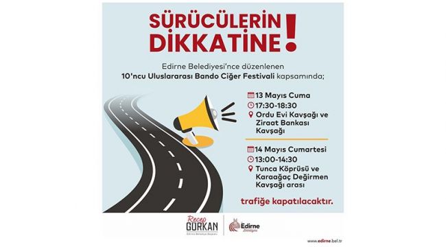Edirne Belediyesi Ulaşım Müdürlüğü, Edirne Belediye Başkanlığı’nca, 2022 Edirne Yılı’nda “Edirne’ye gel, ciğerimi ye” temasıyla 13-14-15 Mayıs tarihlerinde düzenlenecek olan 10. Uluslararası Edirne Bando ve Ciğer Festivali nedeniyle bazı güzergahların trafiğe kapatılacağını duyurdu.