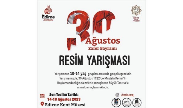 30 Ağustos Zafer Bayramı, bu yıl çocukların yapacağı resimlerle taçlanacak. Edirne Belediyesi tarafından 10-14 yaş grubundaki çocuklar arasında gerçekleştirilecek 30 Ağustos Zafer Bayramı” konulu resim yarışmasında birinci Ipad, ikinci Katlanabilir Bisiklet, üçüncü ise Bluetooth Kulaklık kazanacak. Dereceye giren eserler bilborardlarda sergilenecek.