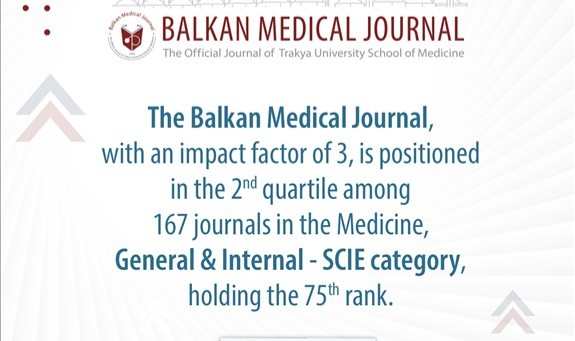 SCIE ve SSCI'da indekslenen dergilerin atıf performanslarını gösteren Journal Citation Reports 2023 (JCR) yayımlandı. Trakya Üniversitesi Balkan Medical Journal, yayınlanan raporda 3.0 etki faktörü ile Türkiye’de genel tıp dergileri arasında birinci sırada yer alarak başarısını devam ettirdi. Üç yıl üst üste bu kategoride listenin zirvesine yerleşen ve aynı kategoride ikinci çeyrek (Q2) dergileri içinde yer alan tek Türkiye dergisi olan Balkan Medical Journal, Türkiye'den tüm kategorilerde dizinlenen 257 dergi arasında beşinci olurken dünyada genel tıp dergileri kategorisinde 75. sırada yer aldı.
