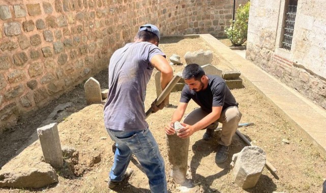 Hazirelerde yapılan çevre temizliğinin ardından mezar taşları, aslına uygun biçimde onarılıyor.