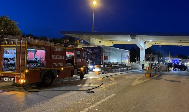 Edirne'de TEM otoyolu gişeleri duvarına çarptıktan sonra alev alan otomobil, itfaiye ekipleri tarafından söndürüldü.