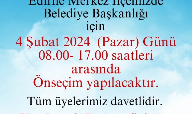 Cumhuriyet Halk Partisi(CHP) geçtiğimiz günlerde Edirne Belediye Başkanı Recep Gürkan’ın sosyal medya da yaptığı Edirne adayı için ön seçim kararının alındığını açıklamıştı. CHP Edirne Teşkilatı, yaptığı duyuru ile alınan karar doğrultusunda CHP Edirne Belediye Başkan adayının, 4 Şubat 2024 Pazar günü yapılacak ön seçim ile belirleneceğini açıkladı.