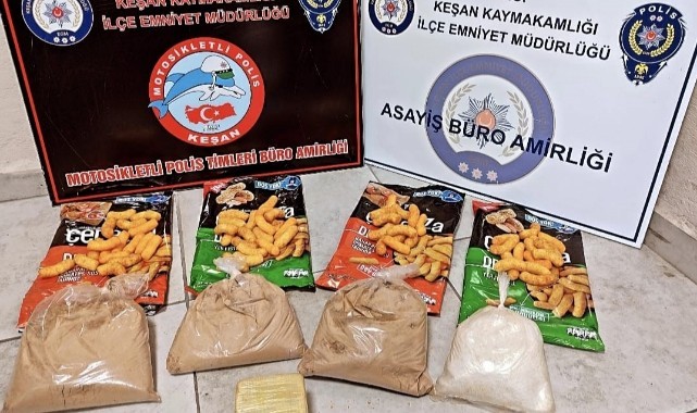 Edirne'nin Keşan ilçesinde cips paketlerine gizlenmiş uyuşturucuyla yakalanan 3 zanlı tutuklandı.