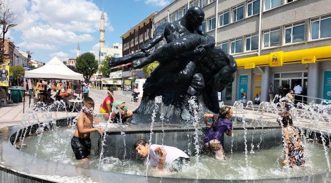 Çocuklar süs havuzuna girerek hem eğlendiler hem serinlediler. (Haber: Gülşah AK)