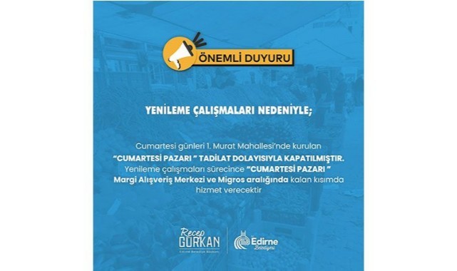 Edirne Belediye Meclisi’nin 2023 yılı Mayıs Ayı toplantısında alınan karar ile depreme dayanıklı hale getirilmesi planlanan Cumartesi Pazarı’nda çalışmalar başladı.Edirne Belediye Meclisi’nin 2023 Yılı Mayıs ayı toplantısında 1. Murat Mahallesinde bulunan ve "Cumartesi Pazarı" olarak kullanılan yapının günümüz deprem yönetmeliğine uygun kapalı pazaryeri olarak projelendirilip yapılması gündeme gelmişti. Meclis toplantısında Edirne Belediye Başkanı Recep Gürkan tarafından Cumartesi Pazarı’nın 1995 yılında yapıldığını ve yapının deprem yönetmeliğine uygun hale gelmesi için komple yenilenmesi gerektiğini söylemişti. 1. Murat Mahallesinde bulunan ve "Cumartesi Pazarı" olarak kullanılan yapının günümüz deprem yönetmeliğine uygun kapalı pazaryeri olarak projelendirilip yapılması işi belediye meclisi tarafından oy birliği ile kabul edilmişti.Alınan Meclis Kararı gereği çalışmaların başladığı ve 5 Ağustos 2023 tarihi dahil olmak üzere Cumartesi Pazarı’nın Margi Alışveriş Merkezi ve Migros arasında bulunan alanda kurulacağı duyuruldu.Çalışmalar tamamlandığında Cumartesi Pazarı tekrar eski yerinde ve depreme dayanıklı bir yapı ile vatandaşlara hizmet verecek. (Haber merkezi)
