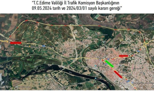 T.C. Edirne Valiliği İl Trafik Komisyon Başkanlığının 09.05.2024 tarih ve 2024/03-01 sayılı kararı gereği; Atatürk Caddesi (D-100 Karayolu-Batı Girişi) Kapıkule Yolu Caddesi (KM 219-182) üzerinde bulunan demiryolu üst geçidinde yapılacak yüksek hızlı tren (YHT) çalışmaları sebebi ile çalışma yapılacak demiryolunun bulunduğu nokta, Kapıkule istikametinde yarın itibariyle 1 (bir) ay süre ile geçişlere kapatılacaktır.