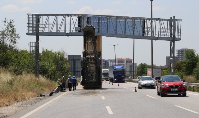 Edirne'de seyir halindeyken damperi açılan tırın dorsesi dijital trafik bilgilendirme panosuna çarptı.İlhami Yörük idaresindeki 39 AF 907 plakalı tırın 22 BA 861 plakalı damperli dorsesi, Edirne gişeleri yakınlarında seyir halindeyken arızası nedeniyle açıldı.Dorse trafik bilgilendirme panosuna çarptı. Çarpmanın etkisiyle dorseden ayrılan tır yaklaşık 50 metre sonra durabildi.Trafik panosunda hasara neden olan dorse vinç yardımıyla kaldırıldı.Kaza nedeniyle kapanan yol çalışmaların ardından trafik akışına açıldı. (AA)