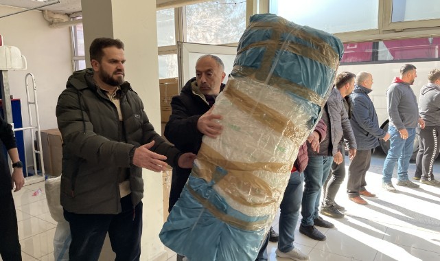 Belirlenen alanlarda toplanan yardımlar tanzim edilerek tırlara yükleniyor.