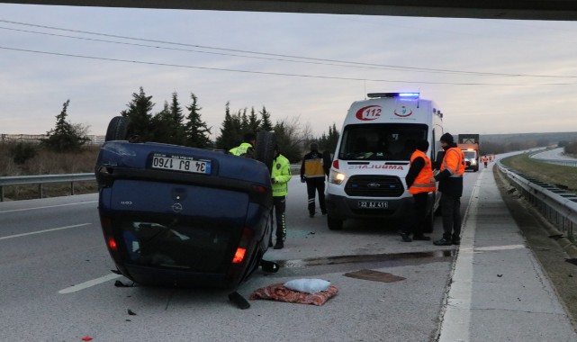 Edirne'de bariyere vurup devrilen otomobilde bulunan anne, baba ve oğlu yaralandı.