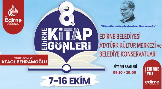 Özlemle beklenen Edirne 8. Kitap Günleri, 7-16 Ekim 2022 tarihleri arasında Edirne Belediyesi Atatürk Kültür Merkezi ve Belediye Konservatuarı’nda kapılarını ziyaretçilerine açıyor. Türkiye’nin çok değerli yayınevleri ve yazarlarının katılımıyla gerçekleştirilecek olan Edirne 8. Kitap Günleri’nin onur konuğu ise Şair/Yazar Ataol Behramoğlu olacak. 35 yayınevinin ve 60’ın üzerinde yazarın katılım sağlayacağı Edirne 8. Kitap Günleri’nde ayrıca söyleşiler ve imza günleri de düzenlenecek.