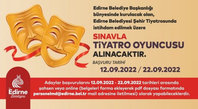 Edirne Belediye Başkanı Recep Gürkan, Eylül ayı Olağan Meclis Toplantısı’nda Edirne Belediyesi Şehir Tiyatrosu ve Çocuk Tiyatrosu’nun kurulacağının müjdesini vermişti. Bu kapsamda Edirne Belediyesi Atatürk Kültür Merkezi ve Belediye Konservatuarı’nda hizmete girecek olan Edirne Belediyesi Şehir Tiyatrosu ve Çocuk Tiyatrosu’nda görev yapacak 10 adet tiyatro oyuncusu alımı gerçekleştirilecek.