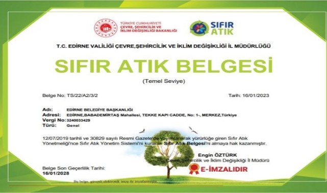 Edirne Belesiyesi İklim Değişikliği ve Sıfır Atık Müdürlüğü’ne 12 Temmuz 2019 tarihli ve 30829 sayılı Resmi Gazete ’de yayımlanarak yürürlüğe giren Sıfır Atık Yönetmeliği’nin tüm şartlarını tamamlayarak Edirne Belediyesi yetki ve sınır alanları içeresinde 1.sınıf atık getirme merkezi, mobil atık getirme merkezleri, geri dönüşüm ve atık kumbaralarını 2022 yılında tamamlayarak, vatandaşların kullanımına sunması üzerine Çevre Şehircilik ve İklim Değişikliği Bakanlığı tarafından 16.01.2023 tarihinde Mahalli İdareler İçin Sıfır Atık Belgesi verildi.