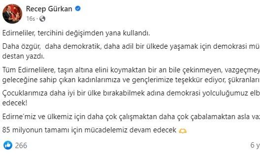 Sosyal medya hesabından yaptığı paylaşımda, Edirne’de demokrasi mücadelesinde destan yazıldığını ifade eden Belediye Başkanı Recep Gürkan, şu ifadeleri kullandı; “Edirneliler, tercihini değişimden yana kullandı. Daha özgür, daha demokratik, daha adil bir ülkede yaşamak için demokrasi mücadelesinde adeta destan yazdı. Tüm Edirnelilere, taşın altına elini koymaktan bir an bile çekinmeyen, vazgeçmeyen, kendi geleceğine sahip çıkan kadınlarımıza ve gençlerimize teşekkür ediyor, şükranlarımı sunuyorum. Çocuklarımıza daha iyi bir ülke bırakabilmek adına demokrasi yolculuğumuz elbette devam edecek! Edirne’miz ve ülkemiz için daha çok çalışmaktan daha çok çabalamaktan asla vazgeçmeyeceğiz. 85 milyonun tamamı için mücadelemiz devam edecek.” (Haber: Ali KARAMAN)