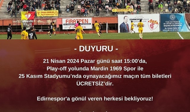 Edirnespor, TFF 3’üncü lig Grup 1’de Play-off mücadelesine devam ediyor. Edirnespor yönetimi 21 Nisan 2024 Pazar günü Mardin 1969 ile oynanacak karşılaşmanın Edirne halkına ücretsiz olacağını belirterek, tüm Edirnelilerden bu zorlu yolda destek beklediğini açıkladı.