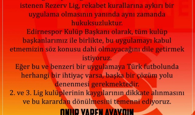Edirnespor Kulüp Başkanı olarak, tüm kulüp başkanlarımız ile birlikte, bu uygulamayı kabul etmemizin söz konusu dahi olmayacağını dile getirmek istiyoruz.