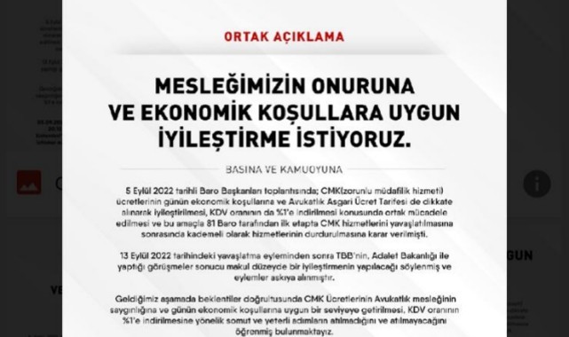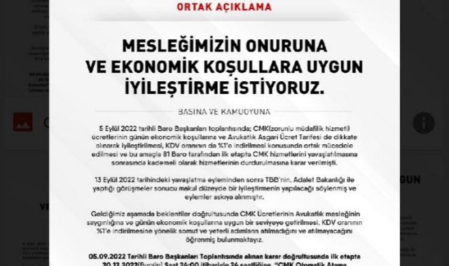 “5 Eylül 2022 tarihli Baro Başkanları toplantısında; CMK(zorunlu müdafilik hizmeti) ücretlerinin günün ekonomik koşullarına ve Avukatlık Asgari Ücret Tarifesi de dikkate alınarak iyileştirilmesi, KDV oranının da %1'e indirilmesi konusunda ortak mücadele edilmesi ve bu amaçla 81 Baro tarafından ilk etapta CMK hizmetlerini yavaşlatılmasına sonrasında kademeli olarak hizmetlerinin durdurulmasına karar verilmişti. 13 Eylül 2022 tarihindeki yavaşlatma eyleminden sonra TBB'nin, Adalet Bakanlığı ile yaptığı görüşmeler sonucu makul düzeyde bir iyileştirmenin yapılacağı söylenmiş ve eylemler askıya alınmıştır. Geldiğimiz aşamada beklentiler doğrultusunda CMK Ücretlerinin Avukatlık mesleğinin saygınlığına ve günün ekonomik koşullarına uygun bir seviyeye getirilmesi, KDV oranının %1'e indirilmesine yönelik somut ve yeterli adımların atılmadığını ve atılmayacağını öğrenmiş bulunmaktayız. 05.09.2022 Tarihli Baro Başkanları Toplantısında alınan karar doğrultusunda ilk etapta 20.12.2022(Bugün) Saat 24:00 itibariyle 24 saatliğine "CMK Otomatik Atama Sistemleri" kapatılacaktır. Avukat görevlendirmeleri 24 saat boyunca sadece şiddet ve istismar mağduru çocuk ve kadınlar için ilgili birimlerin Baro Başkanlıklarına taleplerini (yazılı veya telefonla) ulaştırılması halinde yapılacaktır. Bu süreçte CMK ücretleri ile ilgili devam eden görüşmelerin neticesi de takip edilecek, gelişmeler ışığında karanımızın değiştirilebileceği ve görevlendirmelerin süresiz durdurulabileceğini de (şiddet ve istismar mağduru çocuk ve kadınlar için gelen talepler hariç) kamuoyunun bilgisine sunarız.” (Haber Merkezi)