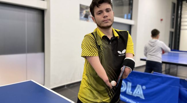 Elleri ve ayaklarında doğuştan bedensel engeli bulunan Sadettin, bandajla sol eline sabitlediği raketiyle masa tenisi oynuyor.