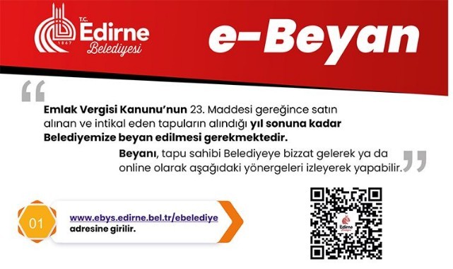 “Emlak Vergisi Kanunun 23 üncü Maddesi gereğince “Yeni bir bina, arsa veya arazi edinilmesi durumunda satın alınan bütçe yılı içerisinde ilgili belediyeye emlak vergi bildirimi yapılmalıdır. Ancak, tapu tescil tarihi yılın son üç ayında olması durumunda tescil tarihinden itibaren 3 ay içerisinde emlak vergi bildirimi yapılmalıdır. Süresinde beyan vermeyen mükelleflere 213 sayılı Vergi Usul Kanunu hükümlerine göre usulsüzlük ve vergi ziyaı cezaları uygulanır.” Beyanı tapu sahibi veya yasal temsilcisi Belediyemize bizzat gelerek beyan verebilir ya da Belediyemizin resmi internet sitesi www.edirne.bel.tr adresine girdikten sonra online işlemler bölümünden beyan vererek işlemlerini tamamlayabilir.