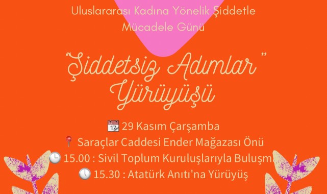 Kadına Karşı Şiddetle Mücadele Haftası kapsamında Avrupa Birliği Türkiye Delegasyonu destekleriyle, Edirne Ticaret ve Sanayi Odası (ETSO) AB Bilgi Merkezi tarafından organize edilen şiddetsiz adımlar yürüyüşü, 29 Kasım Çarşamba günü saat 15.00’de Ender Mağazası’nın önünde sivil toplum kuruluşlarının buluşması ile başlayacak.