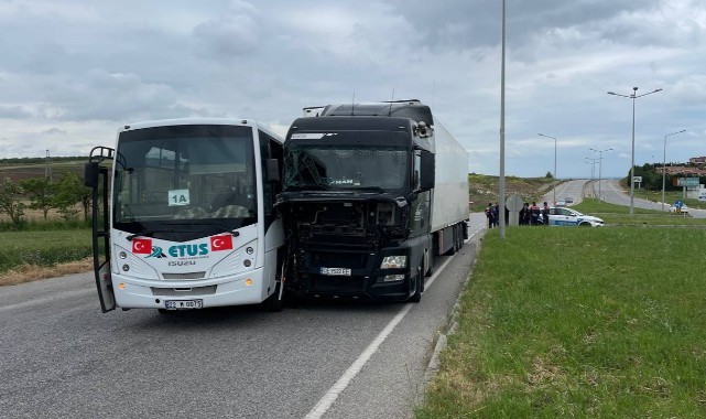 Edirne'de yolcu midibüsüyle tırın çarpışması sonucu 2 kişi yaralandı.Havsa Yolu Villalar mevkiindeki kavşaktan Edirne istikametine dönüş yapan E.K. idaresindeki 22 M 00.. plakalı Edirne Toplu Ulaşım Sistemi'ne (ETUS) ait midibüs, aynı yönde seyreden E.L'nin kullandığı CE 95.. EE plakalı tır ile çarpıştı.Haber verilmesi üzerine kaza yerine 112 Acil Sağlık, jandarma ve polis ekipleri sevk edildi.Yaralanan midibüs sürücüsü E.K. ve bir kadın yolcu sağlık ekiplerince Trakya Üniversitesi Tıp Fakültesi Hastanesi'ne kaldırıldı.Kaza nedeniyle yoldaki ulaşım, bir süre tek şeritten kontrollü sağlandı. (AA)