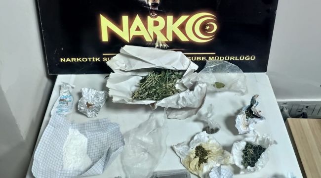 Evde yapılan aramada 7,85 gram metamfetamin, 6,64 gram kokain, 23,84 gram esrar, 0,84 gram eroin, hassas terazi ve 2 uyuşturucu kullanım aparatı ele geçirildi.