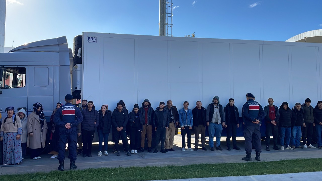 Düzensiz göçmenler işlemlerinin ardından jandarma karakoluna götürüldü, tır sürücüsü gözaltına alındı.(AA)