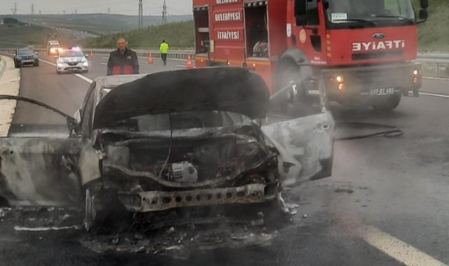 Seyir halindeyken alevleri fark eden sürücü aracını Gelibolu otobanında yol kenarına çekip eşi ve oğluyla araçtan uzaklaştı.