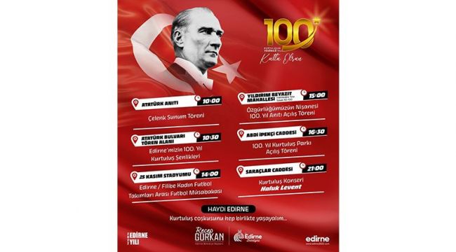 25 Kasım Cuma günü, Edirne kurtuluşunun 100. yılını kutlamaya hazırlanıyor. Edirne Belediyesi, 25 Kasım Cuma Günü Saat:10.00’da Atatürk Anıtı’nda, Saat: 10.30’da Atatürk Bulvarı Tören Alanı’nda düzenlenecek olan resmi törenlerin ardından, bir dizi etkinlik gerçekleştirecek. 100. Yıl coşkusu etkinlikleri kapsamında saat 21.00’da ünlü sanatçı Haluk Levent, Saraçlar Caddesi’nde konser verecek.