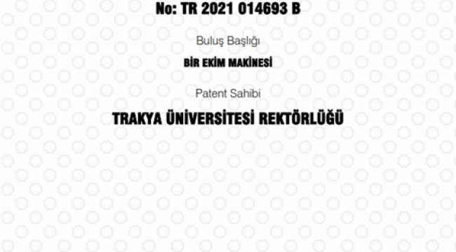 Trakya Üniversitesi Rektörlüğünün patent sahibi olarak yer aldığı buluşun, istenilen ekim derinliğinde hatasız ekim yapabilmesi amacıyla makine ekici ucunun ekim alanında gerçekleştirilen ekim derinliğinin istenilen ekim derinliği ile belirlenen tolerans dahilinde otomasyon sistemi ile sürekli eşit tutan bir ekim makinesi ile ilgili olduğu belirtildi. (Haber Merkezi)