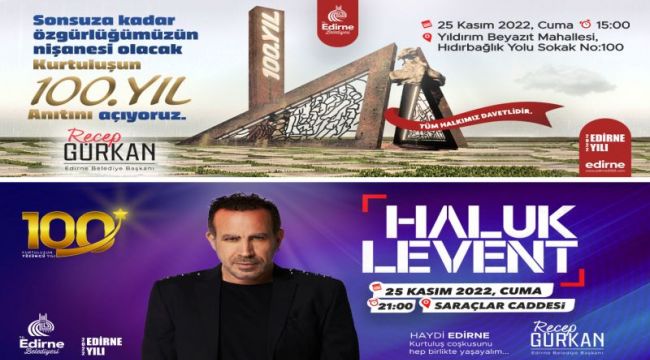 Edirne Belediye Başkanlığı, ünlü sanatçı Haluk Levent’i Edirne’nin Kurtuluşunun 100. Yılı kutlamaları kapsamında 25 Kasım Cuma günü akşamı Edirnelilerle buluşturuyor. Edirne Belediye Başkanı Recep Gürkan, 100. Yıl etkinlikleri kapsamında aynı gün belediye tarafından yaptırılan 100. Yıl Anıtı’nın da açılışını yapacaklarını söyledi.