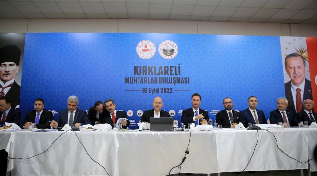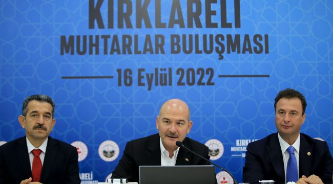 Soylu, 19 Ekim'de 100 muhtarlık binasının temel atma töreniyle bu adımı gerçekleştirmiş olacaklarını ifade ederek, "Bize talepte bulunan muhtarlarımızdan yeri hazır olanların veya yerini bizim hazır edebildiklerimiz, yerini bulabildiklerimizin 100 muhtarlık binasının başlangıcını da yine Sayın Cumhurbaşkanı'mızın ortaya koyduğu irade ile birlikte başlatmış olacağız. Bunu bütün Türkiye geneline yaymış olacağız. İlk adımımızı atıyoruz. Kırklareli'nde hizmet binası bulunmayan muhtarlık sayımız da 39. İnşallah bunu da bir plan dahilinde çok hızlı bir şekilde 19 Ekim'den sonra ortaya koyacağımız bir planlamaya da bunu gerçekleştirmeye çalışacağız." diye konuştu. (AA)