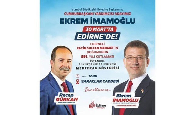 30 Mart Perşembe Günü Saat: 17.00’de Edirneliler ile bir araya gelecek olan Ekrem İmamoğlu, Edirne Belediyesi tarafından Saraçlar Caddesi’nde düzenlenecek ve İstanbul Büyükşehir Belediyesi Mehteran Takımı’nın katılacağı, “Edirneli Fatih Sultan Mehmet’in Doğumunun 591. Yıldönümü Etkinlikleri’ne katılacak.