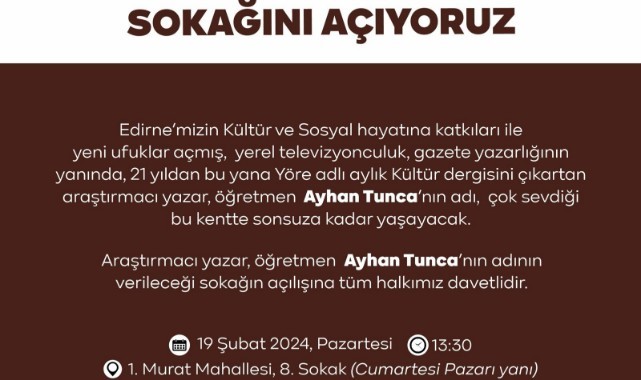 55 yıl boyunca avukatlık mesleğini icra eden Av. İbrahim Karakoç'un İstasyon Mahallesi, 303. Sokağa; Edirne'nin kültür ve sosyal hayatına uzun yıllar boyunca değer katan yerel televizyoncu, araştırmacı yazar ve öğretmen Ayhan Tunca'nın adı ise 1. Murat Mahallesi 8. Sokağa verilecek.