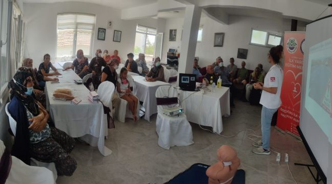 "İlkyardım Eğitim Programımız dahilinde eğitmenlerimiz Emine Aydın Özgür ve Ayten Ülgü Sünetçiler eğitim verdi. Solunumu ve kalbi durmuş birinin 3,5 dakika içerisinde beyin ölümü gerçekleşir. Bu nedenle ambulansın gelmesinin yarım saati bulduğu kırsal alanlarda yaşayan vatandaşlarımızın ilk yardım bilmesi zorunludur, hayatidir. Son derece dikkatli ve ilgili bir grupla eğitimimizi tamamladık." (AA)