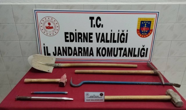 Bu kapsamda jandarma ekipleri tarafından Enez ilçesinde yapılan çalışmalar neticesinde 2 şahıs tarihi eser aramak için kaçak kazı yaptıkları sırada 1 adet kürek,1 adet kazma, 1 adet balyoz, 1 adet manevela, 2 adet murç, ve 1 adet çekiç ile birlikte suçüstü yakalandı.