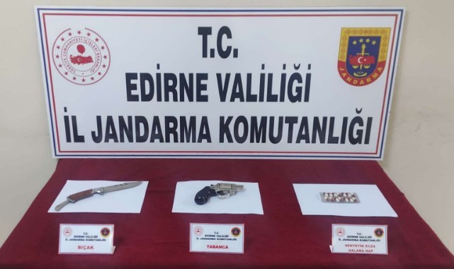 Edirne Jandarma Komutanlığı bir meskende yaptığı arama faaliyeti sonucunda tabanca, bıçak ve sentetik ecza hap ele geçirdi. Şüpheliler hakkında yasala işlemler başlatıldı.