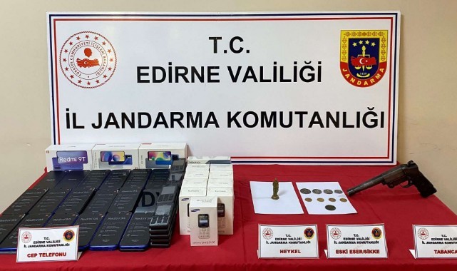 Edirne İl Jandarma Komutanlığı, kaçakçılık olaylarının engellenmesine yönelik çalışmaları kapsamında 56 kaçak cep telefonu, 9 tarihi eser sikke, 1 tarihi eser heykel, 1 tabanca ve 20 kaçak cep telefonu bataryası ele geçirdi.