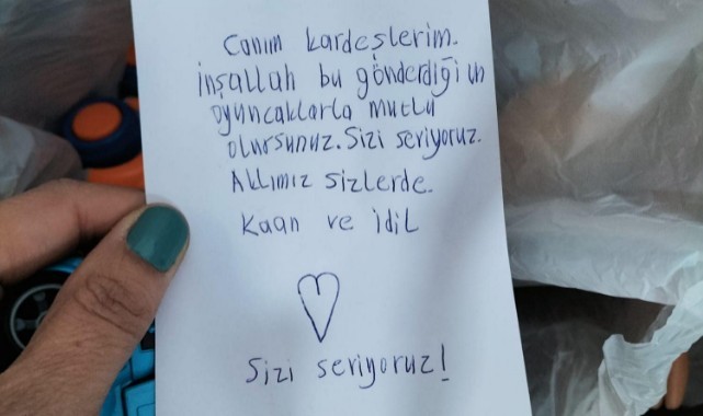 Çocukların deprem bölgesindeki, yaşıtlarına göndermek üzere hazırladığı oyuncaklara yazdıkları notlar ise herkesi duygulandırıyor.